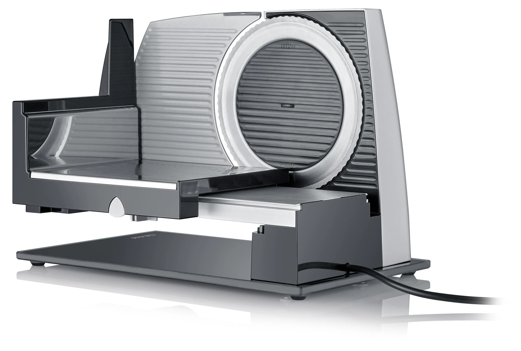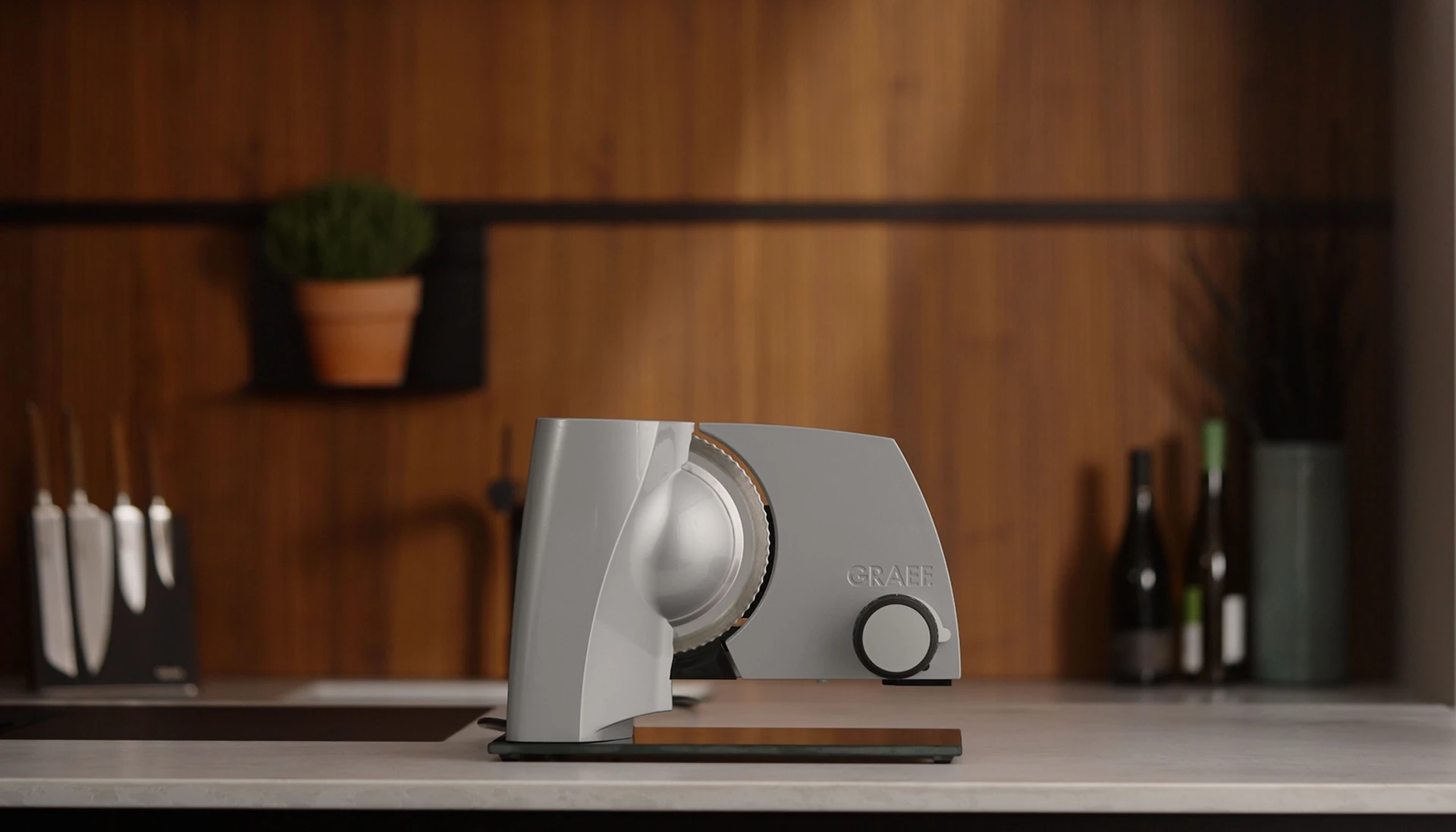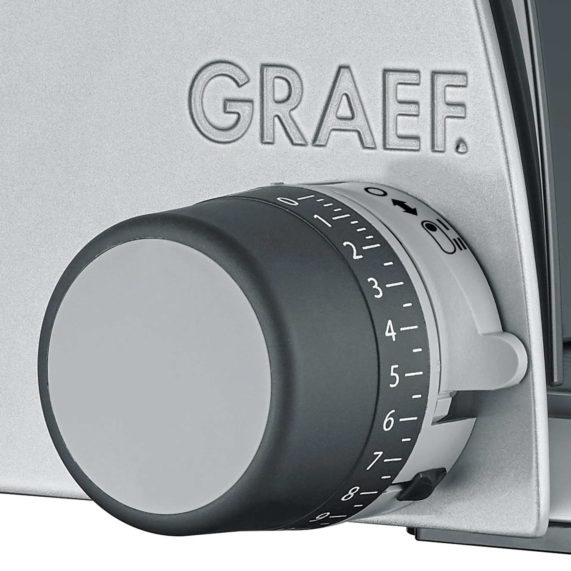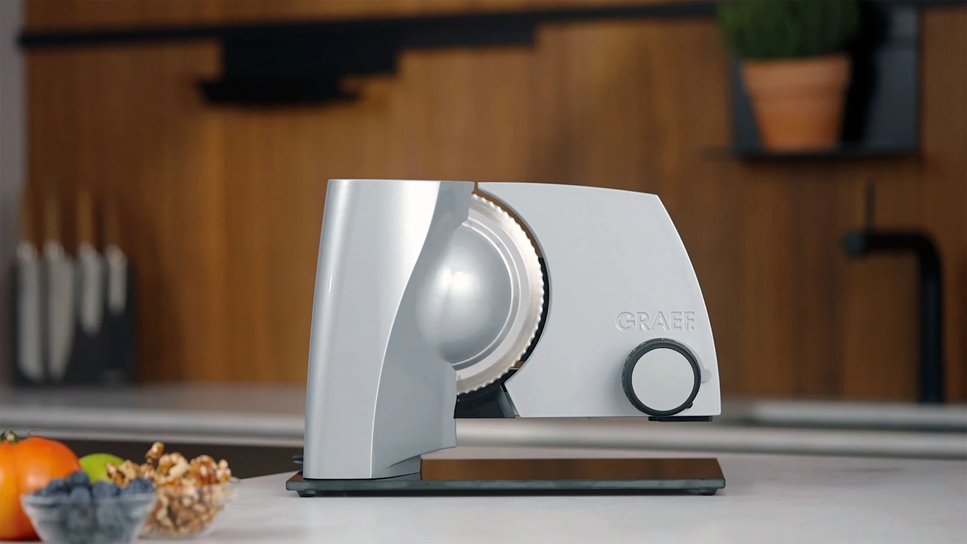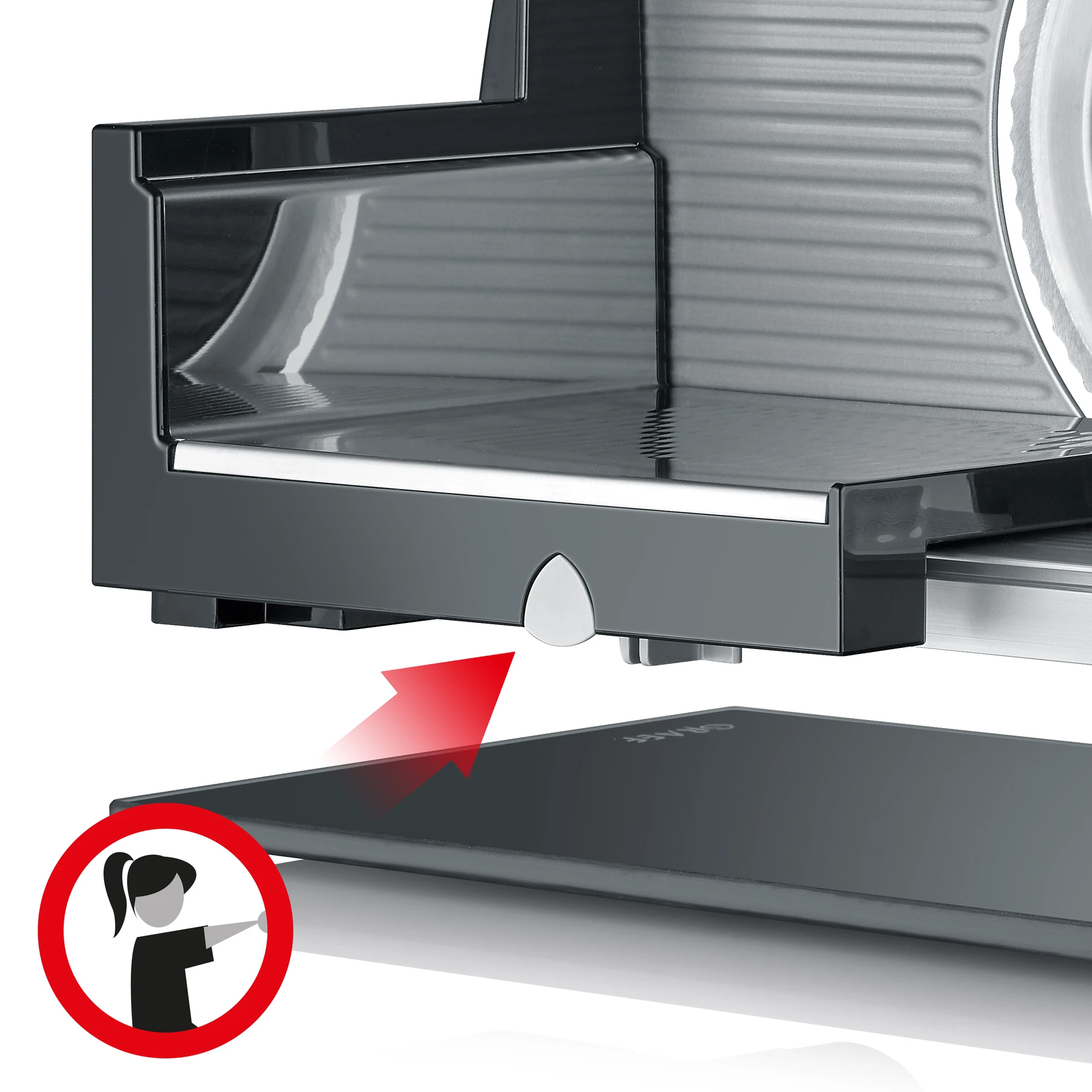 Centrálna ovládacie jednotka sa ovláda jednou rukou a kombinuje nastavenie hrúbky krájania a vypínač s detskou poistkou